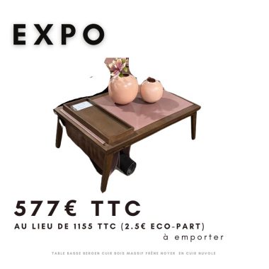Table basse Bergen en bois massif de frêne et noyer, avec revêtement en cuir – Modèle d’exposition